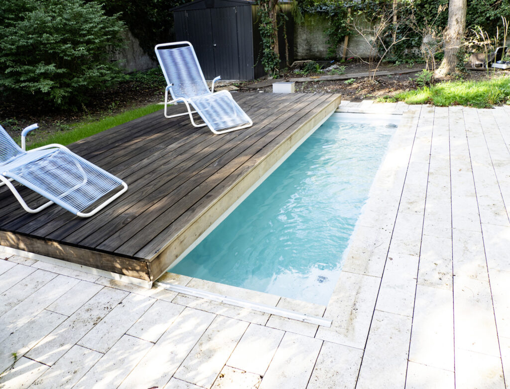 Das – mittels Helikopter – installierte Fertigbecken überrascht mit seiner Abdeckung: Wie von Geisterhand bewegt, fährt die Holzabdeckung weg, auf den ersten Blick ein Terrassendeck mit bequemen Liegestühlen, und gibt den Pool für das erfrischende Bad frei.