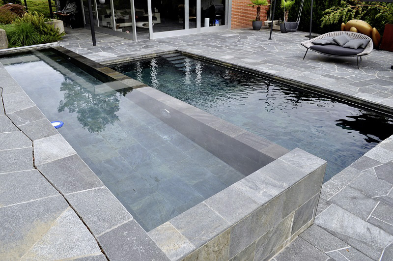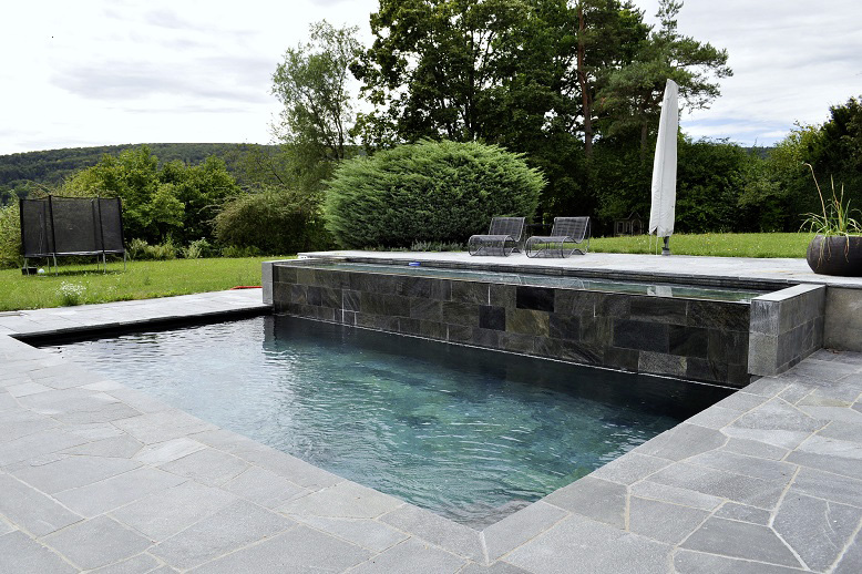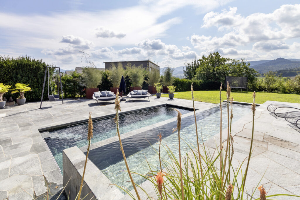«Dieser doppelstufige Betonpool nutzt den Niveauunterschied des Anwesens und brilliert sowohl als Idee, wie auch mit seiner aussergewöhnlichen Natursteinverkleidung aus Zeera Green (Indien), welche je nach Lichteinfall zauberhaft verschiedenfarbig schillert. Die Herausforderung beim Bau bestand darin, das unebene Gelände mit seinen Höhenunterschieden und die anspruchsvolle Architektur in Einklang zu bringen.» So beschrieb die Jury des Aqua Suisse Awards 2022 den für einen Privatkunden gebauten Pool in Baselland. Und hat für den wunderbaren Pool-Traum den zweiten Platz der nationalen Ausscheidung vergeben. Tatsächlich also einer der schönsten Pools in der Schweiz.