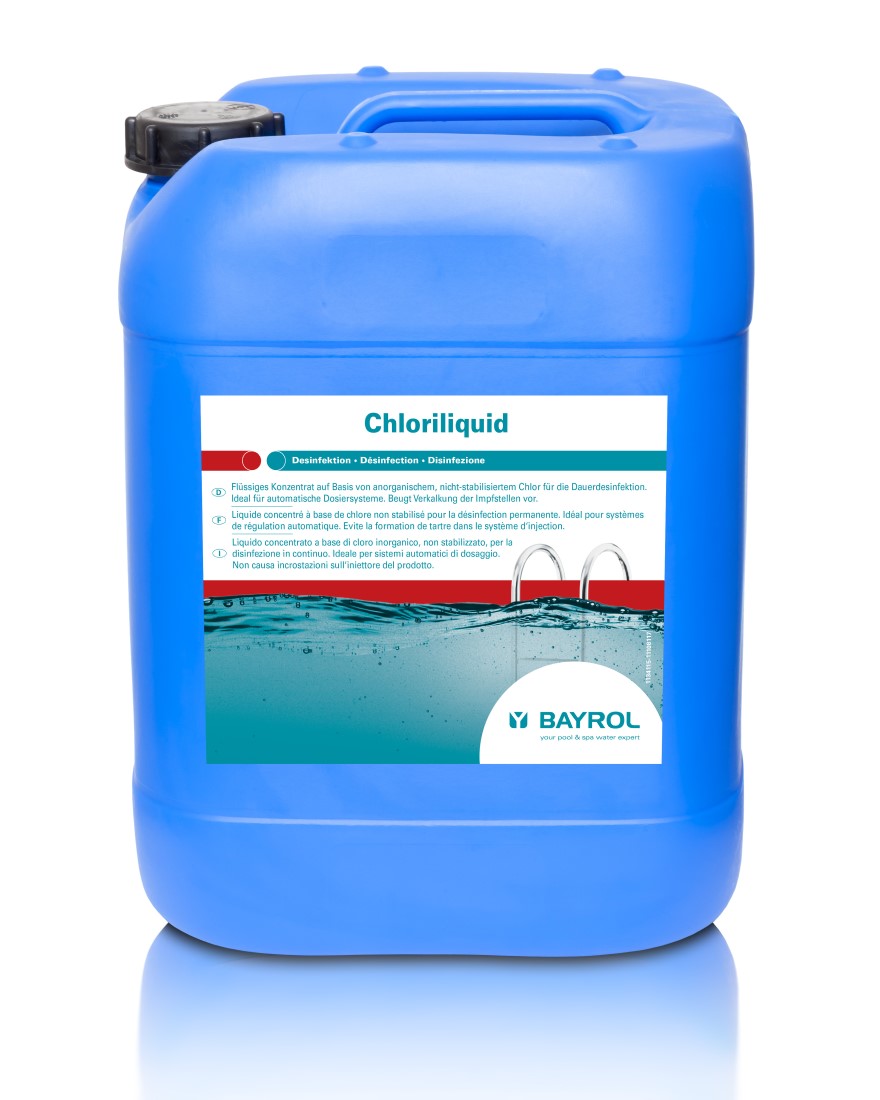 Chloriliquid ist ein flüssiges Konzentrat auf Basis von anorganischem, nicht-stabilisiertem Chlor für die Desinfektion zur Eliminierung von Bakterien und Entfernungen von Trübungen im Poolwasser.