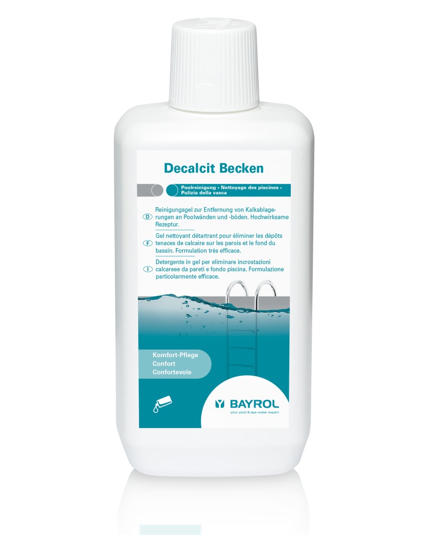 Decalcit Becken ist ein spezielles Reinigungsgel und wird vorrangig bei der Frühjahrsreinigung angewendet, um Kalkablagerungen an Poolwänden und -böden zu entfernen.