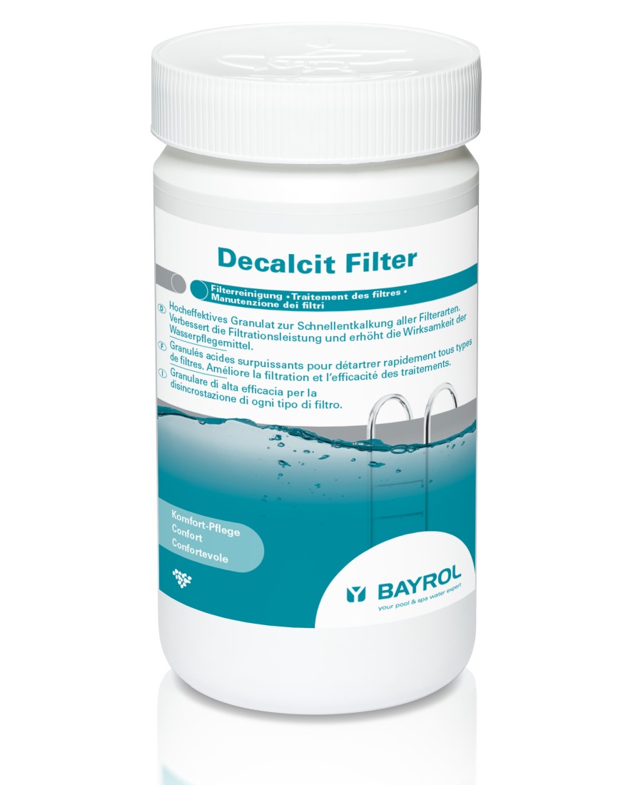 Ist Ihr Pool mit einem Sandfilter ausgestattet, verhindert eine regelmäßige Anwendung von Decalcit Filter die Verkalkung und damit Verklumpung des Filtermaterials (Sand, Glas, etc.). Dies erhält bzw. verbessert die Filtrationsleistung und erhöht gleichzeitig die Wirksamkeit der Wasserpflegemittel.