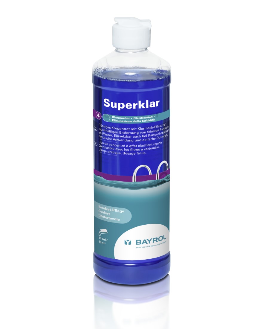 Flüssiges Konzentrat mit Klarmacher-Effekt für kristallklares Wasser zur regelmässigen Entfernung von feinsten Partikeln aus Ihrem Schwimmbadwasser. Superklar ist speziell für Kartuschenfilter geeignet. Kann jedoch auch für AFM®/Sandfilter eingesetzt werden. Durch den praktischen Verschluss ist die Dosierung besonders einfach.